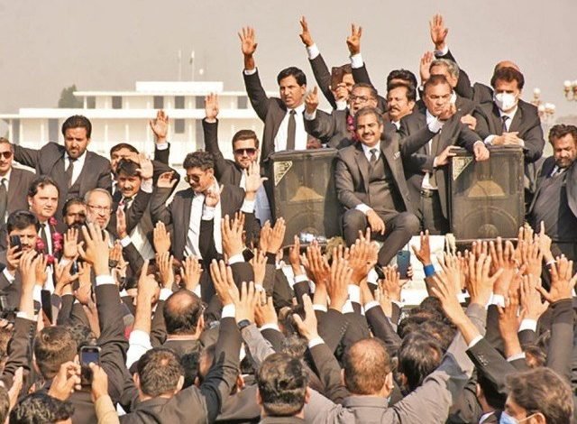 اسلام آباد بار کے وائس چیئرمین ذوالفقار عباسی، اسلام آباد ہائیکورٹ بار کے صدر حسیب چوہدری،عادل عزیزقاضی، علیم عباسی، فریدکیف کے علاوہ راولپنڈی، گوجرخان، گوجرانوالہ اور ٹیکسلا بار کے نمائندے بھی موجودتھے۔ وکلا نے ایف ایٹ کچہری سے ڈی چوک تک ریلی نکالی جس کے دوران اپنے مطالبات کے حق میں نعرے بازی کی۔