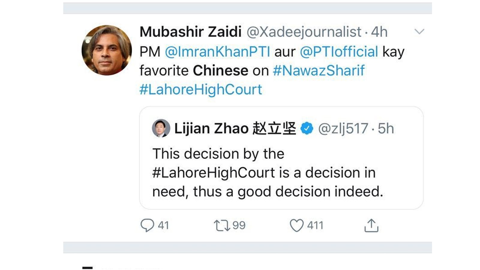 پا کستان میں تعینات چین کے سابق ڈپٹی سفیر لی جیان ژاو جو پاکستانی سیاست میں گہری دلچسپی لینے اور پاکستانی معاملات پر ٹوئٹر پر کھل کر رائے دینے کےلیے شہرت رکھتے ہیں نے سابق وزیراعظم نوازشریف کو بیرون ملک علاج کی اجازت ملنے پر اپنی ٹویٹ میں انہوں نے لکھا تھا کہ ’لاہور ہائی کورٹ کا فیصلہ وقت کی ضرورت تھا اس لیے یقینا یہ ایک اچھا فیصلہ ہے۔ کچھ ہی دیر میں ٹویٹ پر سینکڑوں لوگوں نے تبصرہ کیا اور سات سو سے زائد لوگوں نے اسے ری ٹویٹ کیا جب کہ دو ہزار سے زائد لوگوں نے اسے لائک کیا۔
